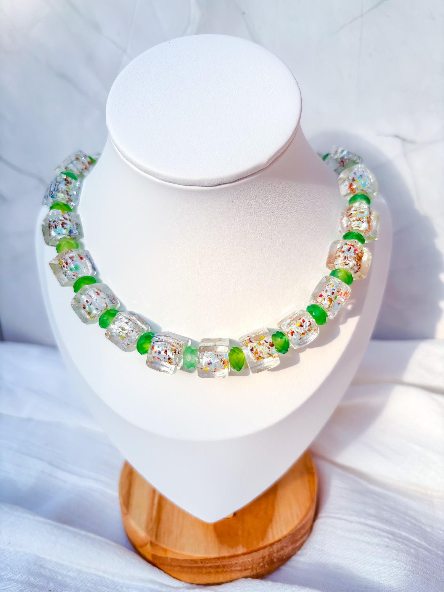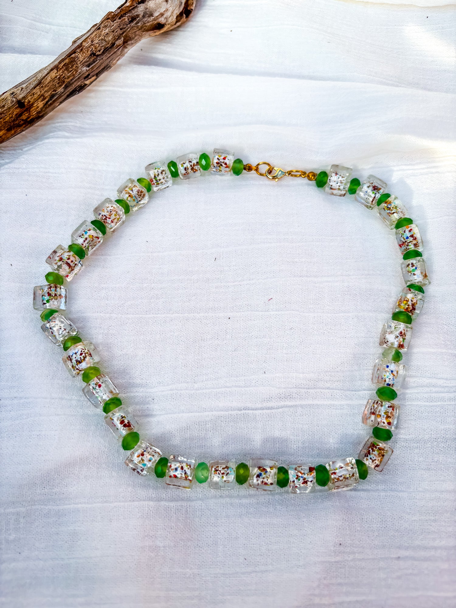 Light, playful, and full of sparkle, this handmade necklace features clear glass beads sprinkled with rainbow flecks, paired with faceted green frosted spacer beads for a soft pop of colour and texture. The mix of iridescent shimmer and frosted green creates a fresh, whimsical look that catches the light beautifully from every angle.
