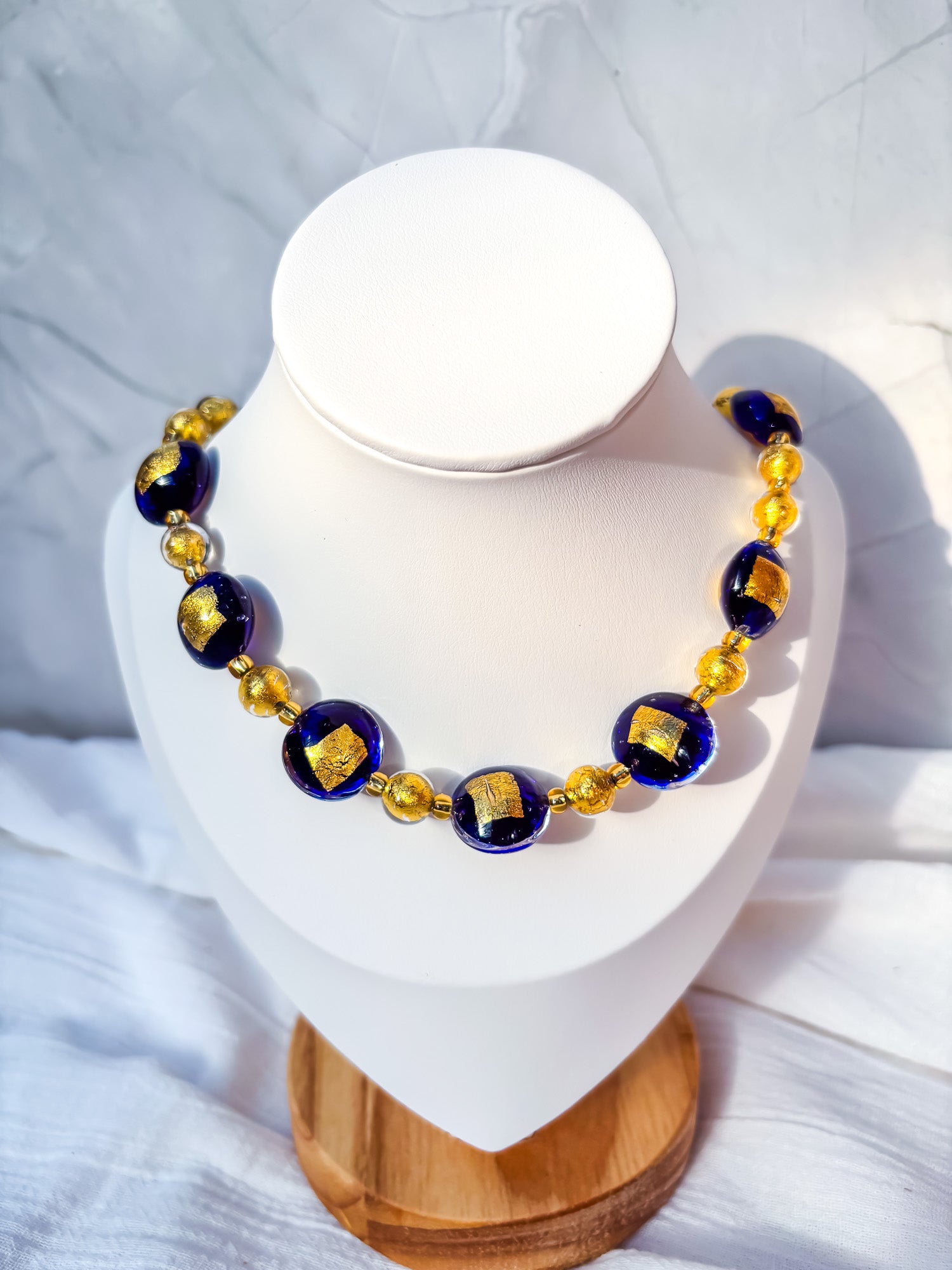 This radiant necklace pairs shimmering foiled gold round beads with exquisite navy and gold Venetian glass feature beads, creating a rich, luxurious palette. The contrast between the deep navy tones and warm gold foil captures the essence of classic Venetian elegance, while the handcrafted glass beads add an artistic, one-of-a-kind charm to the piece.